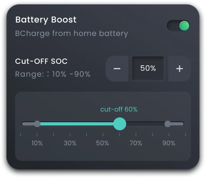 Wanneer u batterijboost activeert, levert de batterij tijdelijk extra vermogen aan de laadpaal. Zo kan uw wagen sneller laden zonder dat uw aansluiting op het net moet worden verzwaard.